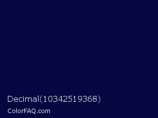 Decimal 10342519368 Color is a very dark blue color and the nearest color is Stratos #000741. Hex code #050840 and RGB value is rgb(5,8,64). In RGB color space, this color is composed of 2% red, 3% green, 25% blue, In CMYK color space, this color is composed of 92% cyan, 88% magenta, 0% yellow , 75% black , In HSL color space, this color has a hue angle of 237° , 86% saturation and 14% lightness.