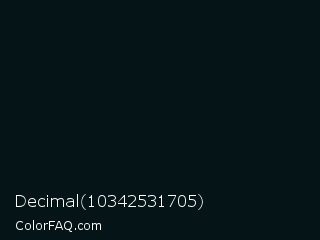Decimal 10342531705 Color is a almost black cyan color and the nearest color is Bunker #0d1117. Hex code #051417 and RGB value is rgb(5,20,23). In RGB color space, this color is composed of 2% red, 8% green, 9% blue, In CMYK color space, this color is composed of 78% cyan, 13% magenta, 0% yellow , 91% black , In HSL color space, this color has a hue angle of 190° , 64% saturation and 5% lightness.