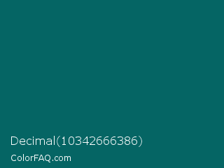 Decimal 10342666386 Color is a very dark cyan color and the nearest color is Blue Stone #016162. Hex code #056564 and RGB value is rgb(5,101,100). In RGB color space, this color is composed of 2% red, 40% green, 39% blue, In CMYK color space, this color is composed of 95% cyan, 0% magenta, 1% yellow , 60% black , In HSL color space, this color has a hue angle of 179° , 91% saturation and 21% lightness.