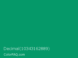 Decimal 10343162889 Color is a normal green color and the nearest color is Green Cyan #009966. Hex code #059969 and RGB value is rgb(5,153,105). In RGB color space, this color is composed of 2% red, 60% green, 41% blue, In CMYK color space, this color is composed of 97% cyan, 0% magenta, 31% yellow , 40% black , In HSL color space, this color has a hue angle of 161° , 94% saturation and 31% lightness.