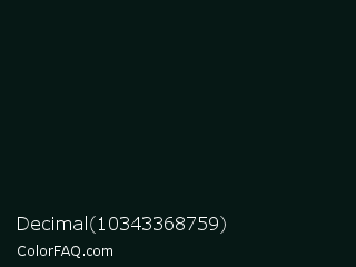 Decimal 10343368759 Color is a almost black cyan color and the nearest color is Black Bean #081910. Hex code #061815 and RGB value is rgb(6,24,21). In RGB color space, this color is composed of 2% red, 9% green, 8% blue, In CMYK color space, this color is composed of 75% cyan, 0% magenta, 13% yellow , 91% black , In HSL color space, this color has a hue angle of 170° , 60% saturation and 6% lightness.