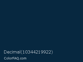Decimal 10344219922 Color is a very dark blue color and the nearest color is Oxford Blue #002147. Hex code #072840 and RGB value is rgb(7,40,64). In RGB color space, this color is composed of 3% red, 16% green, 25% blue, In CMYK color space, this color is composed of 89% cyan, 38% magenta, 0% yellow , 75% black , In HSL color space, this color has a hue angle of 205° , 80% saturation and 14% lightness.