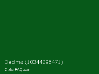 Decimal 10344296471 Color is a very dark green color and the nearest color is Camarone #00581a. Hex code #075919 and RGB value is rgb(7,89,25). In RGB color space, this color is composed of 3% red, 35% green, 10% blue, In CMYK color space, this color is composed of 92% cyan, 0% magenta, 72% yellow , 65% black , In HSL color space, this color has a hue angle of 133° , 85% saturation and 19% lightness.