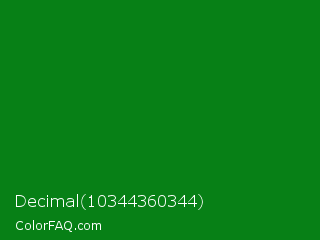 Decimal 10344360344 Color is a dark green color and the nearest color is India Green #138808. Hex code #078016 and RGB value is rgb(7,128,22). In RGB color space, this color is composed of 3% red, 50% green, 9% blue, In CMYK color space, this color is composed of 95% cyan, 0% magenta, 83% yellow , 50% black , In HSL color space, this color has a hue angle of 127° , 90% saturation and 26% lightness.