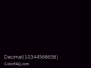 Decimal 10344568658 Color is a almost black magenta color and the nearest color is Jaguar #080110. Hex code #080008 and RGB value is rgb(8,0,8). In RGB color space, this color is composed of 3% red, 0% green, 3% blue, In CMYK color space, this color is composed of 0% cyan, 100% magenta, 0% yellow , 97% black , In HSL color space, this color has a hue angle of 300° , 100% saturation and 2% lightness.