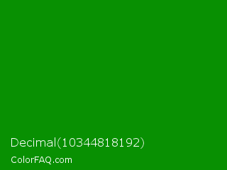 Decimal 10344818192 Color is a dark green color and the nearest color is Islamic Green #009000. Hex code #089002 and RGB value is rgb(8,144,2). In RGB color space, this color is composed of 3% red, 56% green, 1% blue, In CMYK color space, this color is composed of 94% cyan, 0% magenta, 99% yellow , 44% black , In HSL color space, this color has a hue angle of 117° , 97% saturation and 29% lightness.
