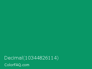 Decimal 10344826114 Color is a normal green color and the nearest color is Green Cyan #009966. Hex code #089766 and RGB value is rgb(8,151,102). In RGB color space, this color is composed of 3% red, 59% green, 40% blue, In CMYK color space, this color is composed of 95% cyan, 0% magenta, 32% yellow , 41% black , In HSL color space, this color has a hue angle of 159° , 90% saturation and 31% lightness.
