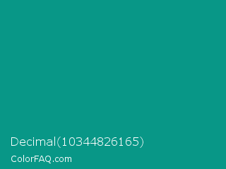 Decimal 10344826165 Color is a normal cyan color and the nearest color is Gossamer #069b81. Hex code #089787 and RGB value is rgb(8,151,135). In RGB color space, this color is composed of 3% red, 59% green, 53% blue, In CMYK color space, this color is composed of 95% cyan, 0% magenta, 11% yellow , 41% black , In HSL color space, this color has a hue angle of 173° , 90% saturation and 31% lightness.