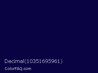 Decimal 10351695961 Color is a very dark indigo color and the nearest color is Stratos #000741. Hex code #090243 and RGB value is rgb(9,2,67). In RGB color space, this color is composed of 4% red, 1% green, 26% blue, In CMYK color space, this color is composed of 87% cyan, 97% magenta, 0% yellow , 74% black , In HSL color space, this color has a hue angle of 246° , 94% saturation and 14% lightness.