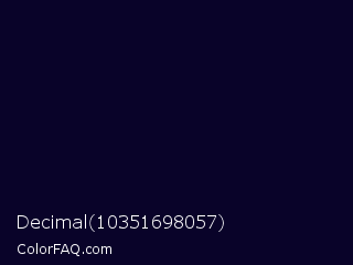 Decimal 10351698057 Color is a almost black indigo color and the nearest color is Black Rock #0d0332. Hex code #090329 and RGB value is rgb(9,3,41). In RGB color space, this color is composed of 4% red, 1% green, 16% blue, In CMYK color space, this color is composed of 78% cyan, 93% magenta, 0% yellow , 84% black , In HSL color space, this color has a hue angle of 249° , 86% saturation and 9% lightness.