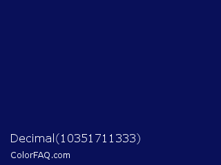 Decimal 10351711333 Color is a very dark blue color and the nearest color is Gulf Blue #051657. Hex code #091059 and RGB value is rgb(9,16,89). In RGB color space, this color is composed of 4% red, 6% green, 35% blue, In CMYK color space, this color is composed of 90% cyan, 82% magenta, 0% yellow , 65% black , In HSL color space, this color has a hue angle of 235° , 82% saturation and 19% lightness.