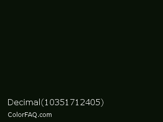 Decimal 10351712405 Color is a almost black green color and the nearest color is Gordons Green #0b1107. Hex code #091207 and RGB value is rgb(9,18,7). In RGB color space, this color is composed of 4% red, 7% green, 3% blue, In CMYK color space, this color is composed of 50% cyan, 0% magenta, 61% yellow , 93% black , In HSL color space, this color has a hue angle of 109° , 44% saturation and 5% lightness.