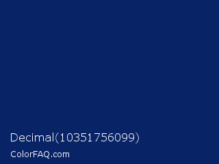 Decimal 10351756099 Color is a very dark blue color and the nearest color is Deep Sapphire #082567. Hex code #092367 and RGB value is rgb(9,35,103). In RGB color space, this color is composed of 4% red, 14% green, 40% blue, In CMYK color space, this color is composed of 91% cyan, 66% magenta, 0% yellow , 60% black , In HSL color space, this color has a hue angle of 223° , 84% saturation and 22% lightness.