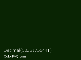 Decimal 10351756441 Color is a almost black green color and the nearest color is Deep Fir #002900. Hex code #092403 and RGB value is rgb(9,36,3). In RGB color space, this color is composed of 4% red, 14% green, 1% blue, In CMYK color space, this color is composed of 75% cyan, 0% magenta, 92% yellow , 86% black , In HSL color space, this color has a hue angle of 109° , 85% saturation and 8% lightness.