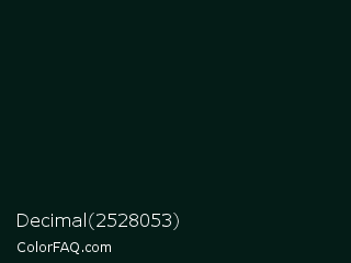Decimal 2528053 Color is a almost black cyan color and the nearest color is Holly #011d13. Hex code #041c17 and RGB value is rgb(4,28,23). In RGB color space, this color is composed of 2% red, 11% green, 9% blue, In CMYK color space, this color is composed of 86% cyan, 0% magenta, 18% yellow , 89% black , In HSL color space, this color has a hue angle of 168° , 75% saturation and 6% lightness.