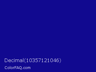 Decimal 10357121046 Color is a dark indigo color and the nearest color is Ultramarine #120a8f. Hex code #110990 and RGB value is rgb(17,9,144). In RGB color space, this color is composed of 7% red, 4% green, 56% blue, In CMYK color space, this color is composed of 88% cyan, 94% magenta, 0% yellow , 44% black , In HSL color space, this color has a hue angle of 244° , 88% saturation and 30% lightness.