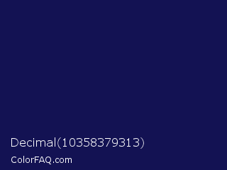 Decimal 10358379313 Color is a very dark indigo color and the nearest color is Bunting #151f4c. Hex code #131253 and RGB value is rgb(19,18,83). In RGB color space, this color is composed of 7% red, 7% green, 33% blue, In CMYK color space, this color is composed of 77% cyan, 78% magenta, 0% yellow , 67% black , In HSL color space, this color has a hue angle of 241° , 64% saturation and 20% lightness.