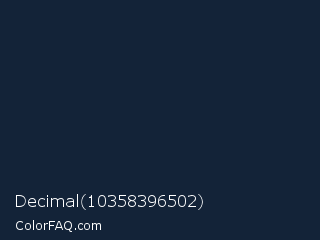 Decimal 10358396502 Color is a very dark blue color and the nearest color is Big Stone #162a40. Hex code #132338 and RGB value is rgb(19,35,56). In RGB color space, this color is composed of 7% red, 14% green, 22% blue, In CMYK color space, this color is composed of 66% cyan, 38% magenta, 0% yellow , 78% black , In HSL color space, this color has a hue angle of 214° , 49% saturation and 15% lightness.