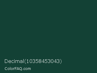 Decimal 10358453043 Color is a very dark cyan color and the nearest color is MSU Green #18453b. Hex code #134135 and RGB value is rgb(19,65,53). In RGB color space, this color is composed of 7% red, 25% green, 21% blue, In CMYK color space, this color is composed of 71% cyan, 0% magenta, 18% yellow , 75% black , In HSL color space, this color has a hue angle of 164° , 55% saturation and 16% lightness.