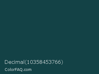 Decimal 10358453766 Color is a very dark cyan color and the nearest color is MSU Green #18453b. Hex code #134246 and RGB value is rgb(19,66,70). In RGB color space, this color is composed of 7% red, 26% green, 27% blue, In CMYK color space, this color is composed of 73% cyan, 6% magenta, 0% yellow , 73% black , In HSL color space, this color has a hue angle of 185° , 57% saturation and 17% lightness.