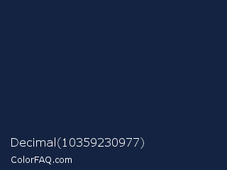 Decimal 10359230977 Color is a very dark blue color and the nearest color is Big Stone #162a40. Hex code #142341 and RGB value is rgb(20,35,65). In RGB color space, this color is composed of 8% red, 14% green, 25% blue, In CMYK color space, this color is composed of 69% cyan, 46% magenta, 0% yellow , 75% black , In HSL color space, this color has a hue angle of 220° , 53% saturation and 17% lightness.