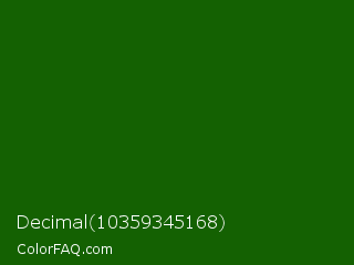 Decimal 10359345168 Color is a very dark green color and the nearest color is Lincoln Green #195905. Hex code #146102 and RGB value is rgb(20,97,2). In RGB color space, this color is composed of 8% red, 38% green, 1% blue, In CMYK color space, this color is composed of 79% cyan, 0% magenta, 98% yellow , 62% black , In HSL color space, this color has a hue angle of 109° , 96% saturation and 19% lightness.