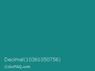Decimal 10361050756 Color is a normal cyan color and the nearest color is Elm #1c7c7d. Hex code #168684 and RGB value is rgb(22,134,132). In RGB color space, this color is composed of 9% red, 53% green, 52% blue, In CMYK color space, this color is composed of 84% cyan, 0% magenta, 1% yellow , 47% black , In HSL color space, this color has a hue angle of 179° , 72% saturation and 31% lightness.