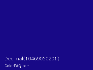 Decimal 10469050201 Color is a dark indigo color and the nearest color is Ultramarine #120a8f. Hex code #180987 and RGB value is rgb(24,9,135). In RGB color space, this color is composed of 9% red, 4% green, 53% blue, In CMYK color space, this color is composed of 82% cyan, 93% magenta, 0% yellow , 47% black , In HSL color space, this color has a hue angle of 247° , 88% saturation and 28% lightness.