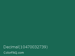 Decimal 10470032739 Color is a dark cyan color and the nearest color is Dark Spring Green #177245. Hex code #196853 and RGB value is rgb(25,104,83). In RGB color space, this color is composed of 10% red, 41% green, 33% blue, In CMYK color space, this color is composed of 76% cyan, 0% magenta, 20% yellow , 59% black , In HSL color space, this color has a hue angle of 164° , 61% saturation and 25% lightness.