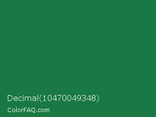 Decimal 10470049348 Color is a dark green color and the nearest color is Dark Spring Green #177245. Hex code #197844 and RGB value is rgb(25,120,68). In RGB color space, this color is composed of 10% red, 47% green, 27% blue, In CMYK color space, this color is composed of 79% cyan, 0% magenta, 43% yellow , 53% black , In HSL color space, this color has a hue angle of 147° , 66% saturation and 28% lightness.
