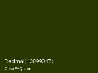 Decimal 40899347 Color is a very dark lime color and the nearest color is Turtle Green #2a380b. Hex code #293801 and RGB value is rgb(41,56,1). In RGB color space, this color is composed of 16% red, 22% green, 0% blue, In CMYK color space, this color is composed of 27% cyan, 0% magenta, 98% yellow , 78% black , In HSL color space, this color has a hue angle of 76° , 96% saturation and 11% lightness.