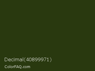 Decimal 40899971 Color is a very dark green color and the nearest color is Turtle Green #2a380b. Hex code #29390f and RGB value is rgb(41,57,15). In RGB color space, this color is composed of 16% red, 22% green, 6% blue, In CMYK color space, this color is composed of 28% cyan, 0% magenta, 74% yellow , 78% black , In HSL color space, this color has a hue angle of 83° , 58% saturation and 14% lightness.