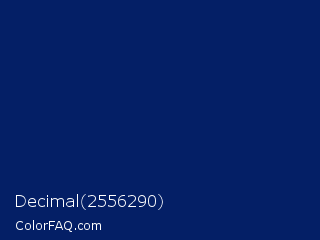 Decimal 2556290 Color is a very dark blue color and the nearest color is Royal Blue #002366. Hex code #041f66 and RGB value is rgb(4,31,102). In RGB color space, this color is composed of 2% red, 12% green, 40% blue, In CMYK color space, this color is composed of 96% cyan, 70% magenta, 0% yellow , 60% black , In HSL color space, this color has a hue angle of 223° , 92% saturation and 21% lightness.