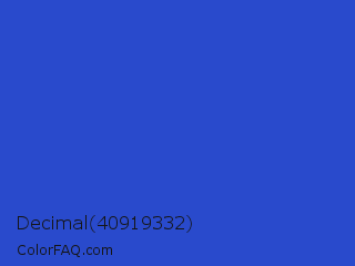 Decimal 40919332 Color is a normal blue color and the nearest color is New Car #214fc6. Hex code #294acc and RGB value is rgb(41,74,204). In RGB color space, this color is composed of 16% red, 29% green, 80% blue, In CMYK color space, this color is composed of 80% cyan, 64% magenta, 0% yellow , 20% black , In HSL color space, this color has a hue angle of 228° , 67% saturation and 48% lightness.