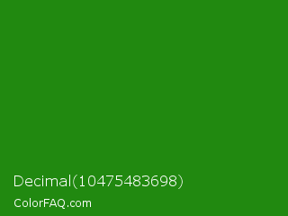 Decimal 10475483698 Color is a dark green color and the nearest color is India Green #138808. Hex code #218910 and RGB value is rgb(33,137,16). In RGB color space, this color is composed of 13% red, 54% green, 6% blue, In CMYK color space, this color is composed of 76% cyan, 0% magenta, 88% yellow , 46% black , In HSL color space, this color has a hue angle of 112° , 79% saturation and 30% lightness.
