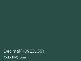 Decimal 40923158 Color is a dark cyan color and the nearest color is Plantation #27504b. Hex code #294e48 and RGB value is rgb(41,78,72). In RGB color space, this color is composed of 16% red, 31% green, 28% blue, In CMYK color space, this color is composed of 47% cyan, 0% magenta, 8% yellow , 69% black , In HSL color space, this color has a hue angle of 170° , 31% saturation and 23% lightness.