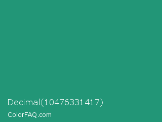 Decimal 10476331417 Color is a normal cyan color and the nearest color is Illuminating Emerald #319177. Hex code #229677 and RGB value is rgb(34,150,119). In RGB color space, this color is composed of 13% red, 59% green, 47% blue, In CMYK color space, this color is composed of 77% cyan, 0% magenta, 21% yellow , 41% black , In HSL color space, this color has a hue angle of 164° , 63% saturation and 36% lightness.