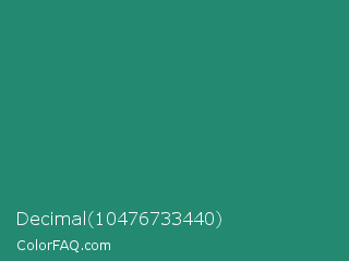 Decimal 10476733440 Color is a normal cyan color and the nearest color is Illuminating Emerald #319177. Hex code #238970 and RGB value is rgb(35,137,112). In RGB color space, this color is composed of 14% red, 54% green, 44% blue, In CMYK color space, this color is composed of 74% cyan, 0% magenta, 18% yellow , 46% black , In HSL color space, this color has a hue angle of 165° , 59% saturation and 34% lightness.