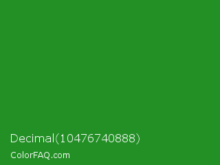 Decimal 10476740888 Color is a normal green color and the nearest color is Forest Green #228b22. Hex code #239026 and RGB value is rgb(35,144,38). In RGB color space, this color is composed of 14% red, 56% green, 15% blue, In CMYK color space, this color is composed of 76% cyan, 0% magenta, 74% yellow , 44% black , In HSL color space, this color has a hue angle of 122° , 61% saturation and 35% lightness.