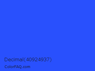 Decimal 40924937 Color is a normal blue color and the nearest color is Ultramarine Blue #4166f5. Hex code #2950fd and RGB value is rgb(41,80,253). In RGB color space, this color is composed of 16% red, 31% green, 99% blue, In CMYK color space, this color is composed of 84% cyan, 68% magenta, 0% yellow , 1% black , In HSL color space, this color has a hue angle of 229° , 98% saturation and 58% lightness.