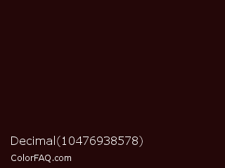 Decimal 10476938578 Color is a almost black red color and the nearest color is Kilamanjaro #240c02. Hex code #240708 and RGB value is rgb(36,7,8). In RGB color space, this color is composed of 14% red, 3% green, 3% blue, In CMYK color space, this color is composed of 0% cyan, 81% magenta, 78% yellow , 86% black , In HSL color space, this color has a hue angle of 358° , 67% saturation and 8% lightness.
