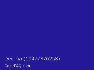 Decimal 10477376258 Color is a normal indigo color and the nearest color is Jacksons Purple #20208d. Hex code #241996 and RGB value is rgb(36,25,150). In RGB color space, this color is composed of 14% red, 10% green, 59% blue, In CMYK color space, this color is composed of 76% cyan, 83% magenta, 0% yellow , 41% black , In HSL color space, this color has a hue angle of 245° , 71% saturation and 34% lightness.
