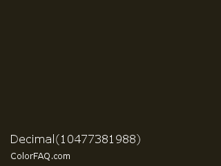 Decimal 10477381988 Color is a very dark orange color and the nearest color is Oil #281e15. Hex code #242014 and RGB value is rgb(36,32,20). In RGB color space, this color is composed of 14% red, 13% green, 8% blue, In CMYK color space, this color is composed of 0% cyan, 11% magenta, 44% yellow , 86% black , In HSL color space, this color has a hue angle of 45° , 29% saturation and 11% lightness.