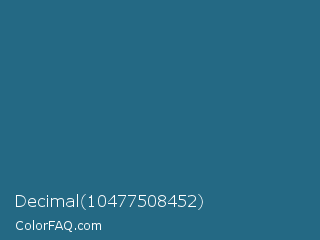 Decimal 10477508452 Color is a normal blue color and the nearest color is Calypso #31728d. Hex code #246984 and RGB value is rgb(36,105,132). In RGB color space, this color is composed of 14% red, 41% green, 52% blue, In CMYK color space, this color is composed of 73% cyan, 20% magenta, 0% yellow , 48% black , In HSL color space, this color has a hue angle of 197° , 57% saturation and 33% lightness.