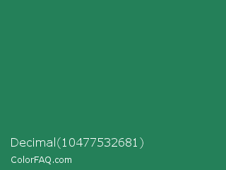 Decimal 10477532681 Color is a normal green color and the nearest color is Eucalyptus #278a5b. Hex code #248059 and RGB value is rgb(36,128,89). In RGB color space, this color is composed of 14% red, 50% green, 35% blue, In CMYK color space, this color is composed of 72% cyan, 0% magenta, 30% yellow , 50% black , In HSL color space, this color has a hue angle of 155° , 56% saturation and 32% lightness.