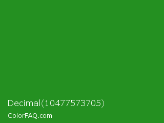 Decimal 10477573705 Color is a normal green color and the nearest color is Forest Green #228b22. Hex code #249021 and RGB value is rgb(36,144,33). In RGB color space, this color is composed of 14% red, 56% green, 13% blue, In CMYK color space, this color is composed of 75% cyan, 0% magenta, 77% yellow , 44% black , In HSL color space, this color has a hue angle of 118° , 63% saturation and 35% lightness.