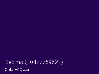 Decimal 10477769621 Color is a very dark violet color and the nearest color is Cherry Pie #2a0359. Hex code #250453 and RGB value is rgb(37,4,83). In RGB color space, this color is composed of 15% red, 2% green, 33% blue, In CMYK color space, this color is composed of 55% cyan, 95% magenta, 0% yellow , 67% black , In HSL color space, this color has a hue angle of 265° , 91% saturation and 17% lightness.
