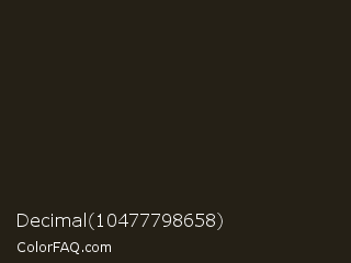 Decimal 10477798658 Color is a very dark orange color and the nearest color is Oil #281e15. Hex code #252016 and RGB value is rgb(37,32,22). In RGB color space, this color is composed of 15% red, 13% green, 9% blue, In CMYK color space, this color is composed of 0% cyan, 14% magenta, 41% yellow , 85% black , In HSL color space, this color has a hue angle of 40° , 25% saturation and 12% lightness.