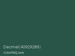 Decimal 40929289 Color is a dark cyan color and the nearest color is Plantation #27504b. Hex code #295549 and RGB value is rgb(41,85,73). In RGB color space, this color is composed of 16% red, 33% green, 29% blue, In CMYK color space, this color is composed of 52% cyan, 0% magenta, 14% yellow , 67% black , In HSL color space, this color has a hue angle of 164° , 35% saturation and 25% lightness.