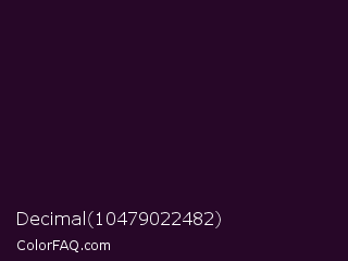 Decimal 10479022482 Color is a almost black magenta color and the nearest color is Jacaranda #2e0329. Hex code #270728 and RGB value is rgb(39,7,40). In RGB color space, this color is composed of 15% red, 3% green, 16% blue, In CMYK color space, this color is composed of 3% cyan, 83% magenta, 0% yellow , 84% black , In HSL color space, this color has a hue angle of 298° , 70% saturation and 9% lightness.
